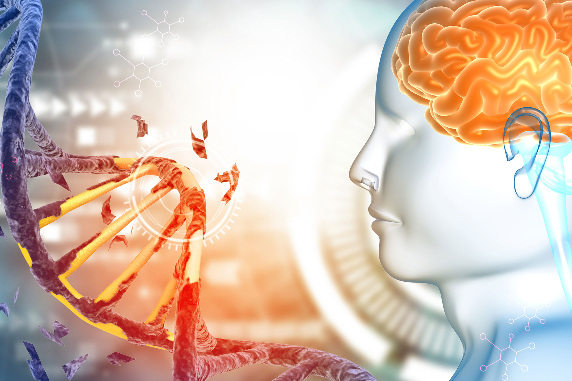 Human brain with DNA strand. 3d illustration